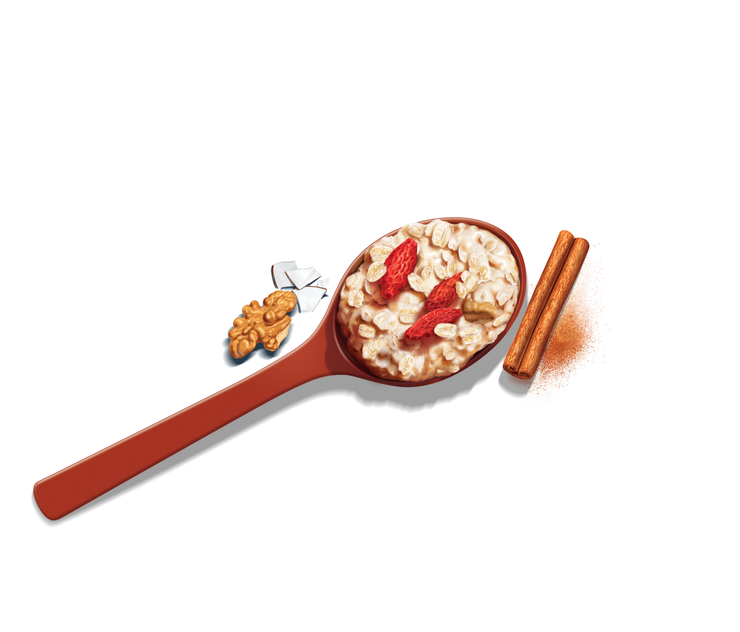 בכוס: שיבולת שועל דקה ועבה, חלבון שמרים, צ'יה, צימוק אוזבקי בהיר, גוז'י ברי, קינמון, הל, מלח הימלאייה ורוד.